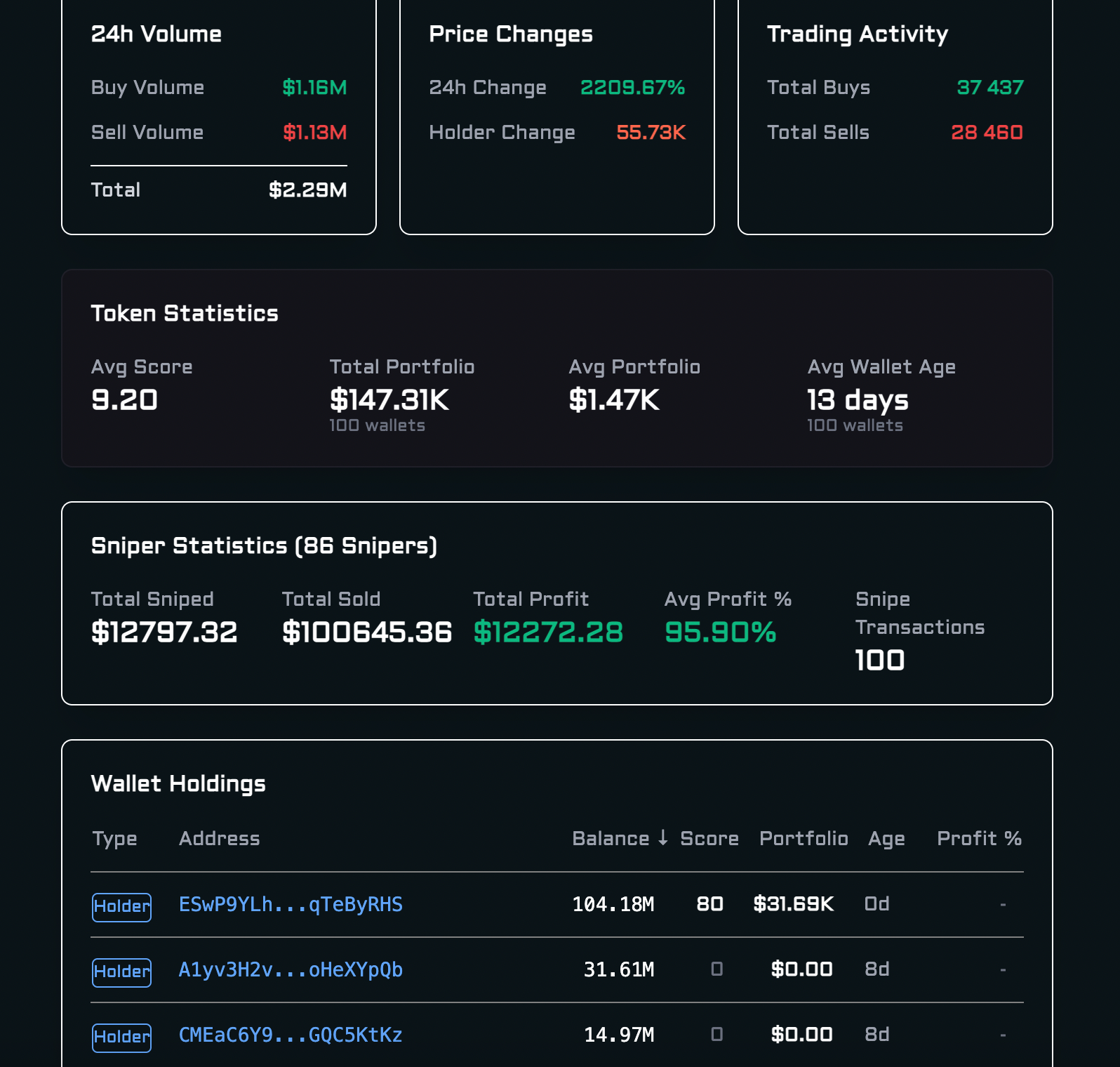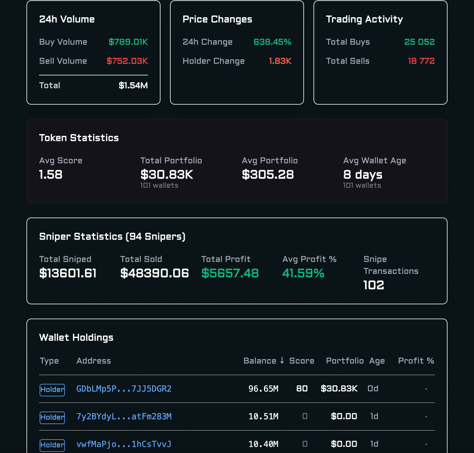 Here we get a list of wallets, and a mark for each wallet - Holder, Sniper or Farmer.