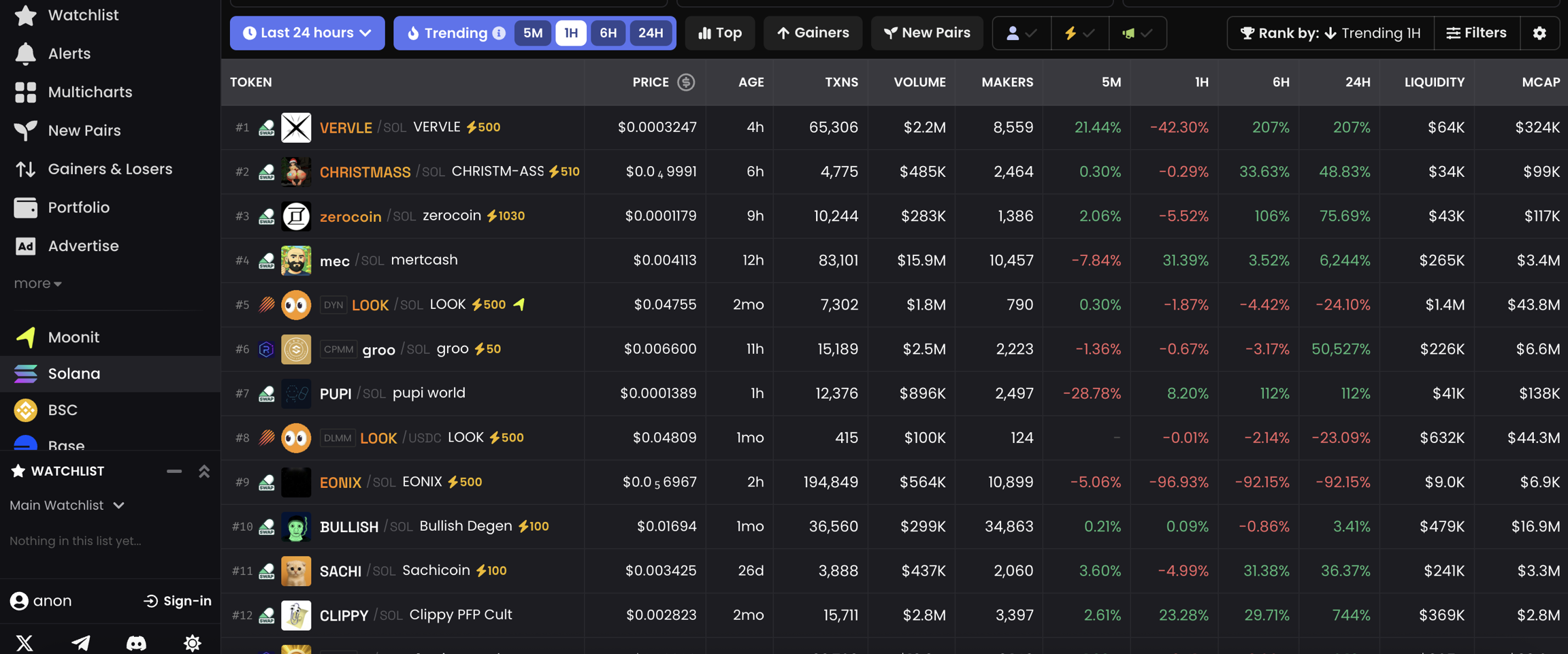 Let's go to the DEX Screener website and select, as an example,the top 1 token by growth for today on the Solana network.